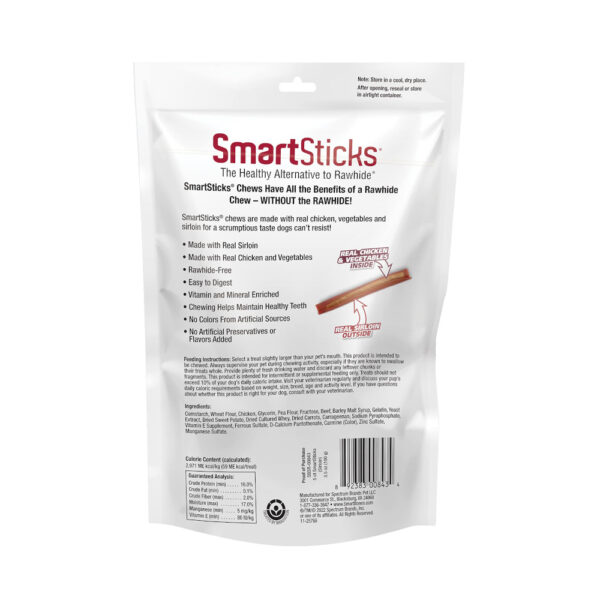 SmartBones SmartSticks made with real sirloin are stick-shaped treats with a sirloin outside wrapped around real chicken and vegetables inside for a scrumptious taste dogs can’t resist. These rawhide-free chews are vitamin and mineral enriched and easy to digest. Plus, they’re made with no colors from artificial sources and no artificial preservatives or flavors added, so you can feel good about treating your dog to one of these delicious chews!